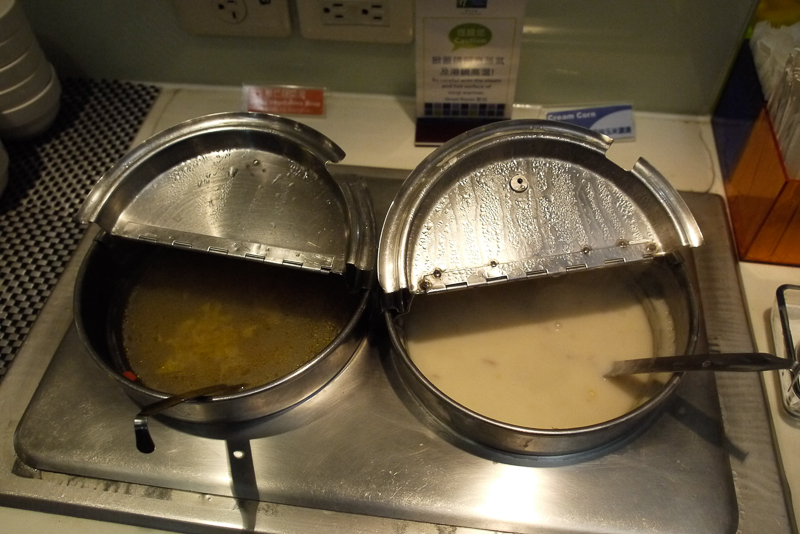 ,左邊是蔬菜湯右邊是自助餐無敵熟客玉米濃湯。 |