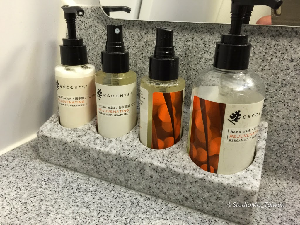 | 長榮的廁所四寶,是用來自加拿大的香氛品牌Escents,味道還不錯! 長榮這幾年在備品上真的看得見用心耶! |