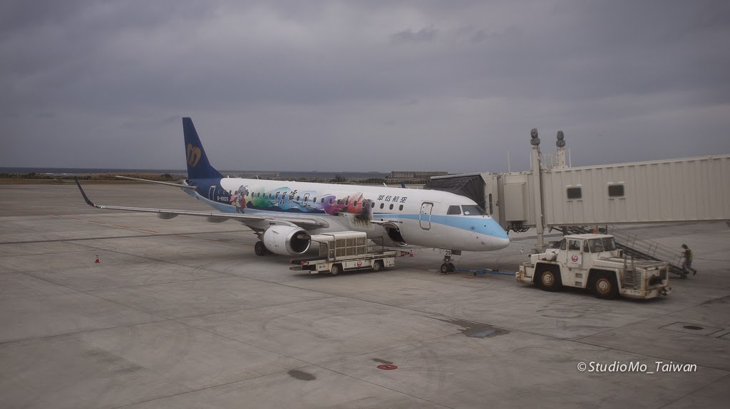| 在沖繩機場國際航廈捕捉到的倩影,但有點髒兮兮~ 後方是日本的天馬航空(SKYMARK)剛好降落! |