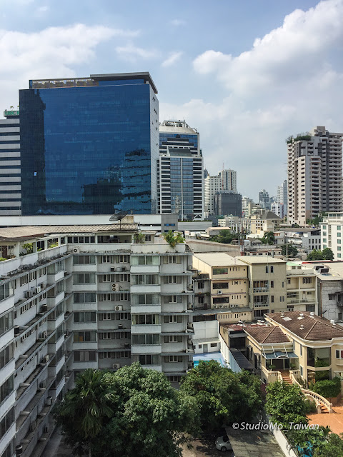 | 從Emporium空中花園往回看,在左側藍色玻璃帷幕大樓右側的建築,就是蓮花曼谷素坤逸酒店,從飯店步行到百貨公司只需五到八分鐘。 |