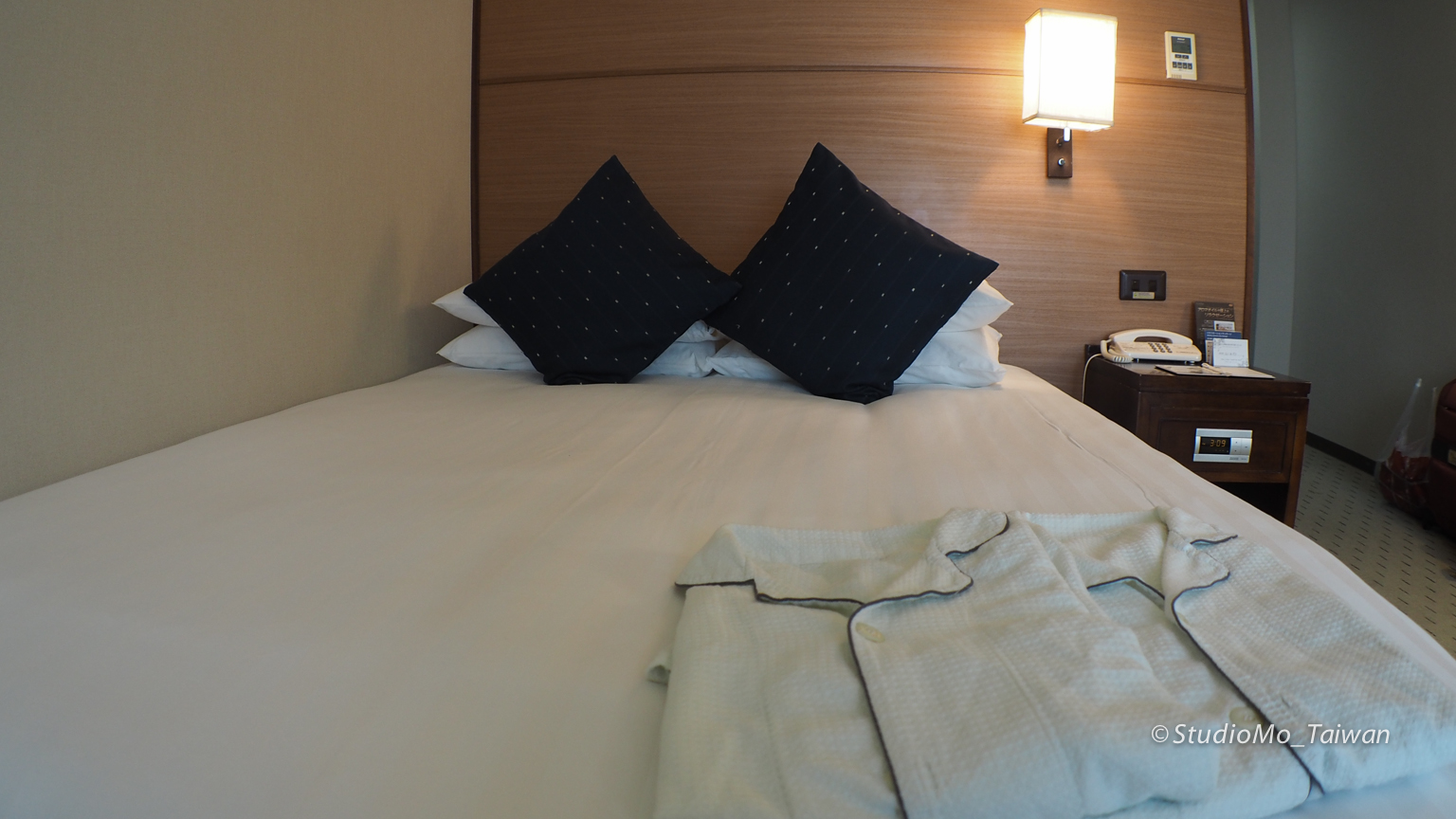 第一晚(2015/09/09 - 2015/09/10)是入住位於13樓的標準大床房,雖然在房間等級沒有升等,但是常在日本旅遊的朋友也應該知道日本單人床和大床的差異,原本預定的單人床房對身高180體重破百的筆者根本是種酷刑,感謝飯店方的體貼!