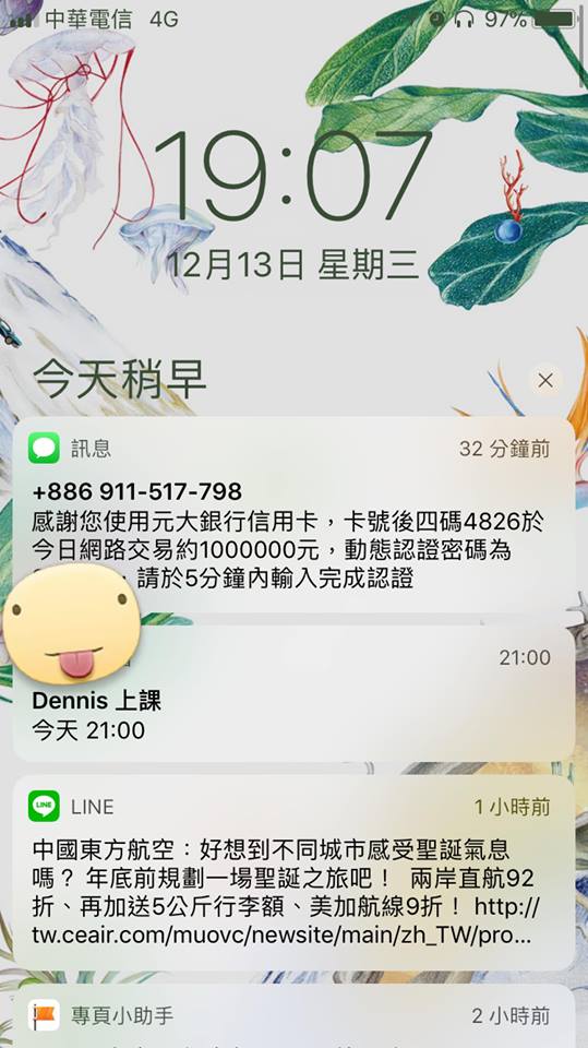 | 筆者買了兩張來回票,收到百萬刷卡簡訊 XD |