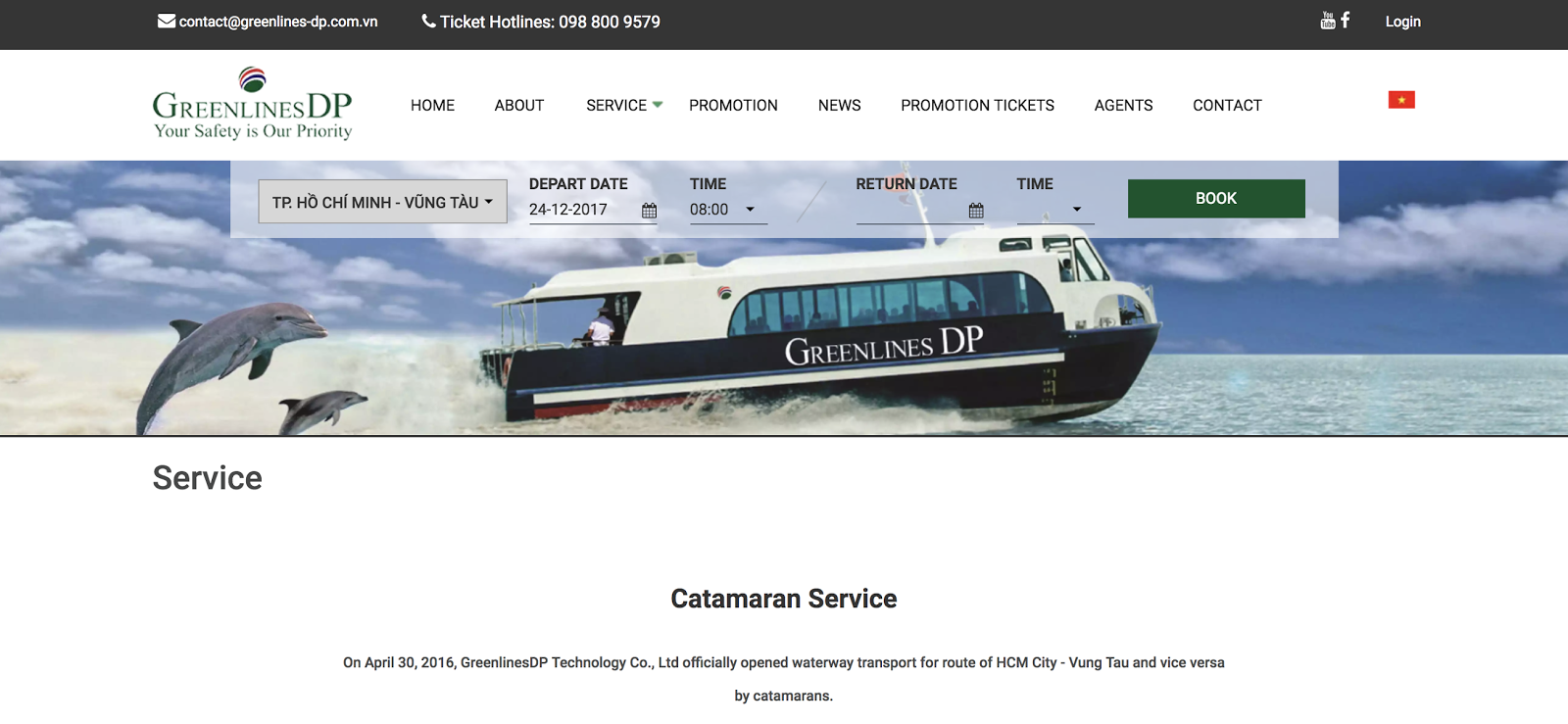 Greenlines DP 渡輪的服務,網站有英文介面,成人單趟是250,000 VND,買票流程如同一班的廉價航空,可以線上刷卡,結帳完就會直接開票到訂票的email信箱,信件內會有一個包含船票的Qrcode條碼的PDF檔,那張就是票,筆者強烈建議一定要把它印出來,不然會在票亭耗費很多時間確認船票。