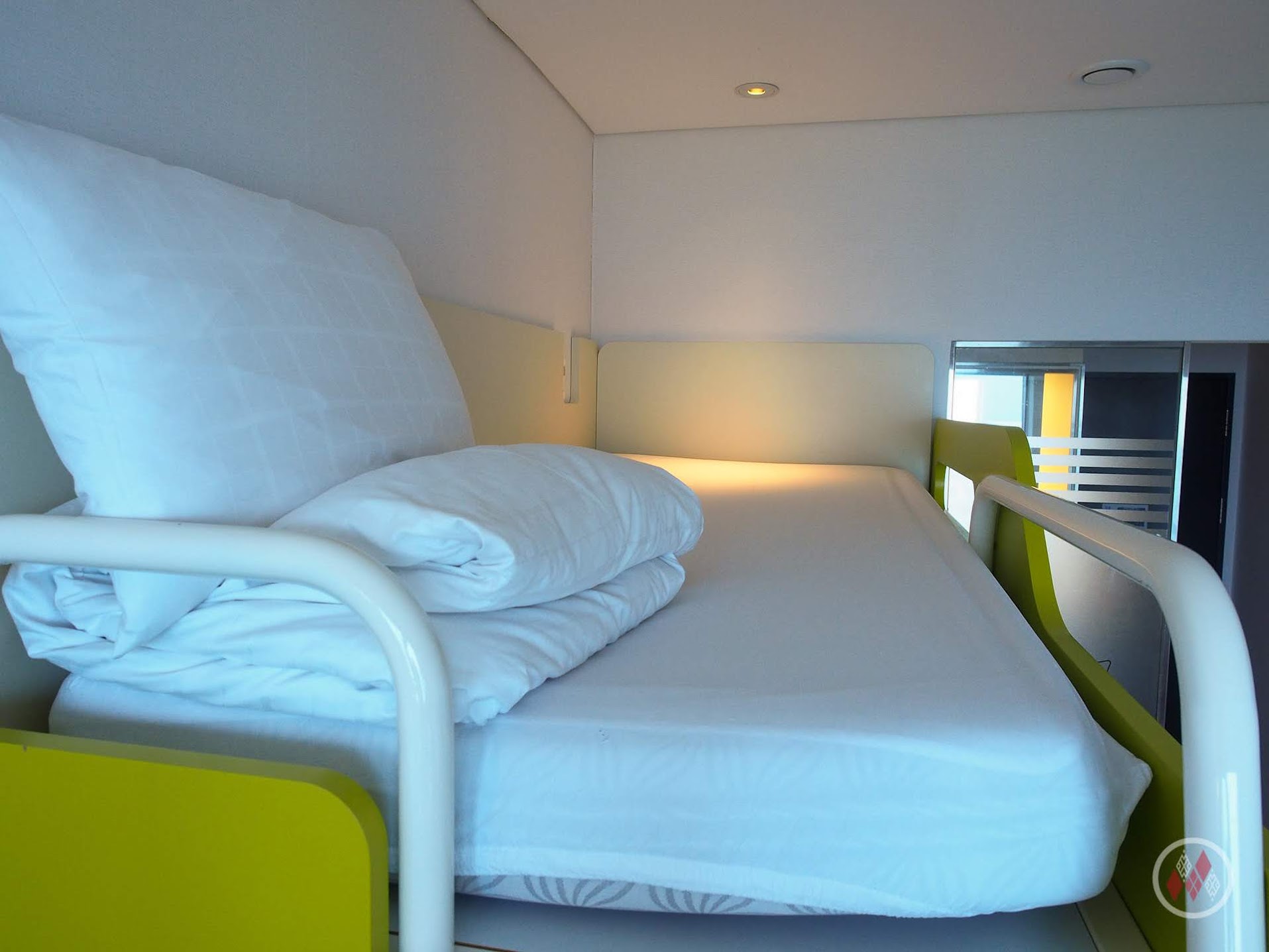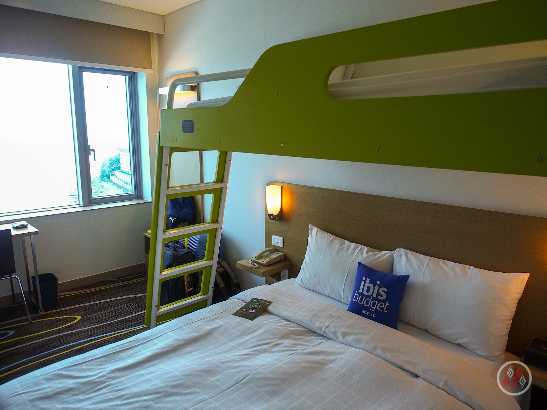 房間的配置是一張標準雙人床,搭配一個上鋪床位,由於上鋪比較高,所以也不會有上下鋪的壓迫感。