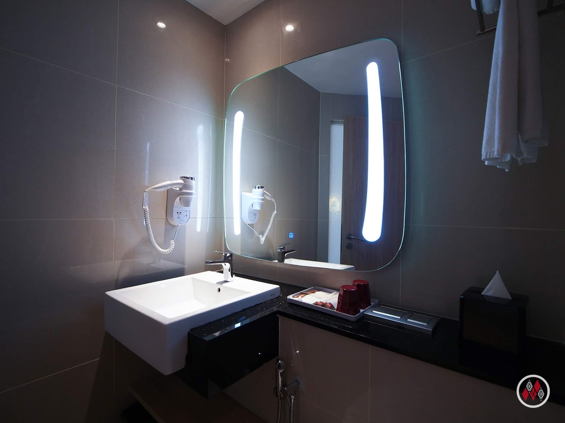 浴廁的空間,維持普通飯店的大小,沒有東南亞宜必思常見的半圓弧形設計,整體空間配置相當舒適,也配有基本的備品和牆上洗髮沐浴合一的液態皂,水壓、水溫也維持一定水準。但就沒有向台北或釜山宜必思,配有洗屁屁的免治馬桶。
