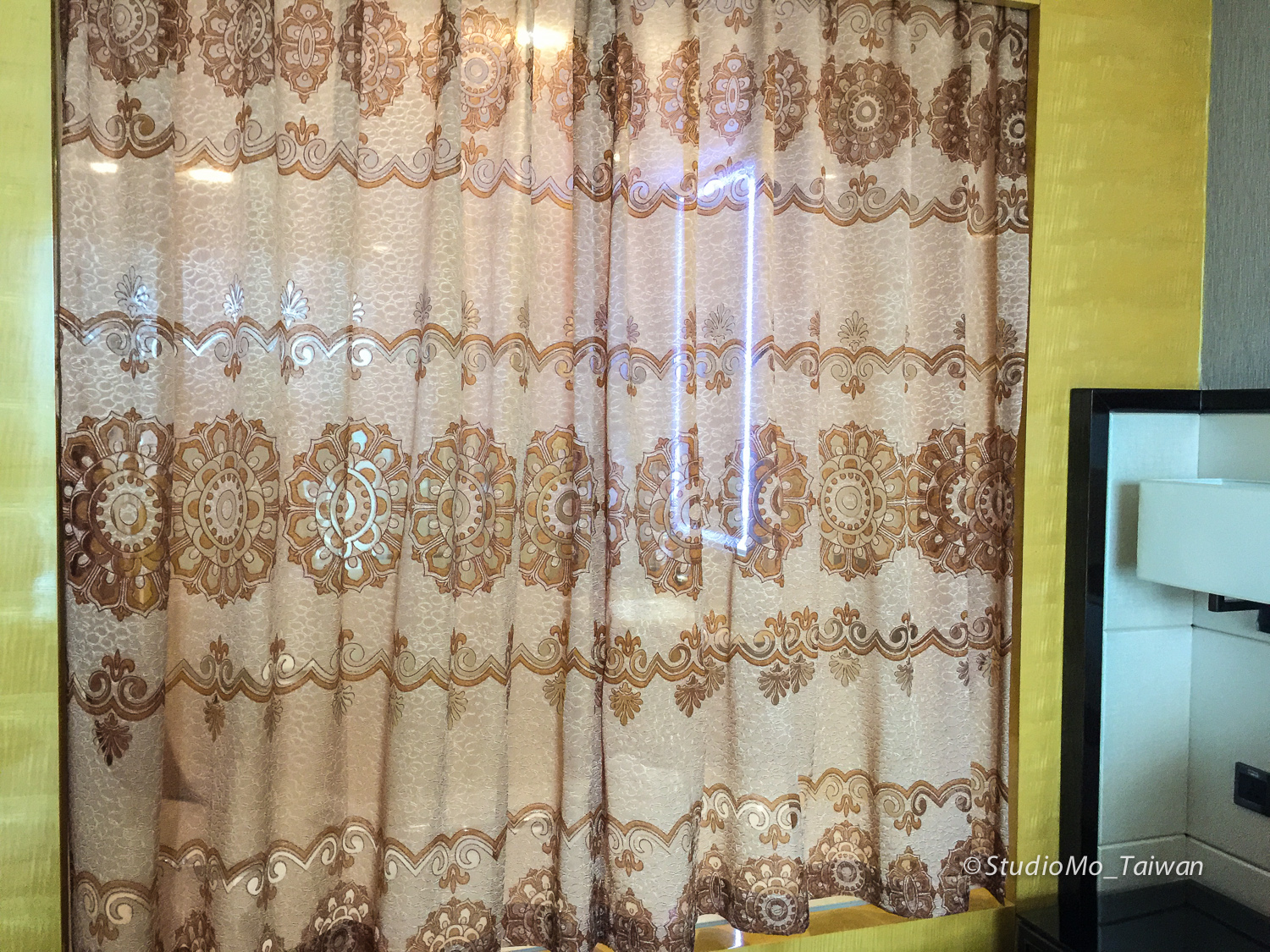 | 臥室和浴室之間有一片玻璃,用的是很low的窗簾隔絕 |